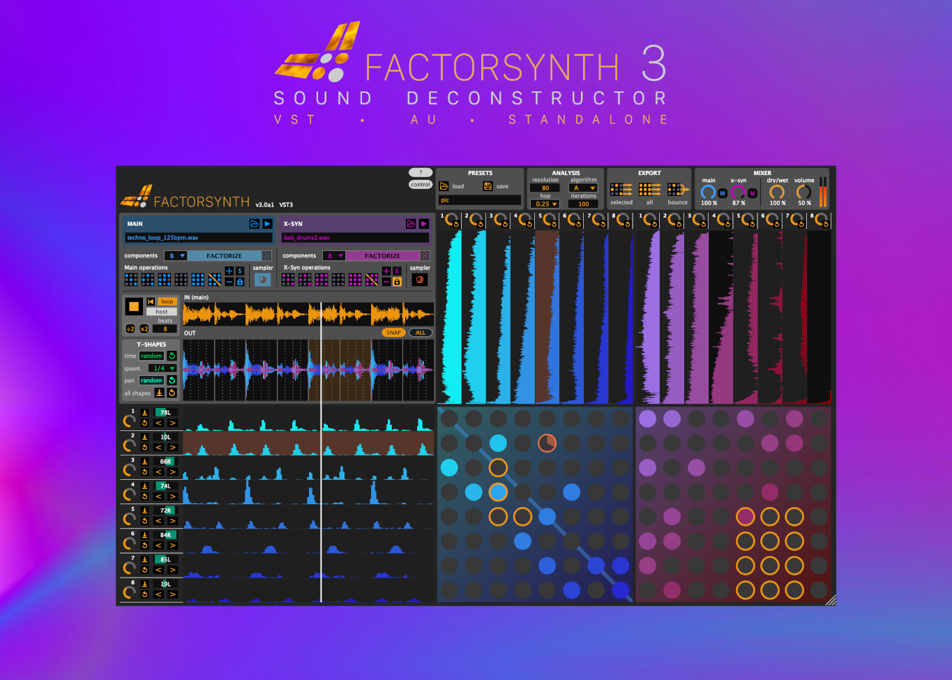"readme_cms_content": "<blockquote>\n<ul>\n<li>Retail Price: 80€ VAT excluded</li>\n<li><a href=\"https://www.ircam.fr/innovations/abonnements-du-forum/\">Premium member</a> price: 60€ VAT excluded - <a href=\"https://shop.ircam.fr/index.php?controller=contact\">ask for the voucher</a>.</li>\n<li>Contact & Technical Support: hello(at)anemond.net</li>\n<li><a href=\"https://anemond.net\">buy</a></li>\n</ul>\n</blockquote>\n<p>Factorsynth is a unique tool for sound deconstruction. It breaks down audio samples into a set of elements using a machine learning algorithm. The pieces are ready for you to rearrange and remix in infinite ways to create complex textures, rhythmic and melodic variations, hybrid sounds and a full new range of sonic transformations!</p>\n<p>First released in 2018 as a Max For Live device, version 3 brings the Factorsynth technology to all VST/AU compatible DAWs. For the first time, it also runs as a standalone application.</p>\n<p><img src=\"https://anemond.net/wp-content/uploads/2023/03/fs3_preorder_difum_sm.png\" alt=\"\" /></p>\n<h2 id=\"system-requirements\">System Requirements</h2>\n<ul>\n<li>Mac OS (Intel/Apple M1) or Windows</li>\n</ul>\n<h2 id=\"the-factorsynth-project\">The Factorsynth project</h2>\n<p>J.J Burred started the Factorsynth project in 2014, first doing research on creative applications of a data analysis method called matrix factorization (hence the name). I have since then released several prototype versions for command line and plain Max. These old versions were not real-time capable but have been used by several composers of electronic and electroacoustic music for detailed sound editing and spatialization. Here are some works that have used Factorsynth:</p>\n<ul>\n<li>\n<p><a href=\"https://jjburred.com/blog/factorsynth-in-the-current-machine-learning-landscape/\">Factorsynth's place in the Machine Learning landscape</a> by J.J Burred, October 2020.</p>\n</li>\n<li>\n<p><a href=\"https://soundcloud.com/maurizio-azzan/where-the-here-and-now-of-nowhere-is\">Where the Here and Now of Nowhere Is</a> by <a href=\"https://www.ircam.fr/person/maurizio-azzan/\">Maurizio Azzan</a>. Premiered at the IRCAM Manifeste festival, Centre Pompidou, Paris, June 2018.</p>\n</li>\n<li>\n<p><a href=\"https://soundcloud.com/emanuele-palumbo/laura-della-distanza\">L’Aura della Distanza</a> by <a href=\"https://www.ircam.fr/person/emanuele-palumbo/\">Emanuele Palumbo</a>. Premiered at CNSMDP, Paris, January 2017.</p>\n</li>\n<li>\n<p><a href=\"https://www.youtube.com/watch?v=Y2FsVPMagew&t=0s\">Khorwa, Myalwa</a> by <a href=\"https://www.ircam.fr/person/mikhail-malt/\">Mikhail Malt</a>. Recorded in 2017.</p>\n</li>\n</ul>",