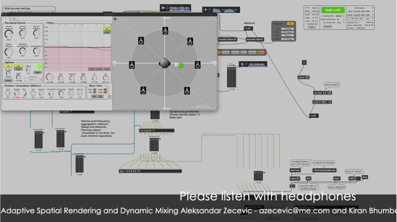 objects dynamically influence one another and interact with static beds, generating shifting amplitude and frequency relationships and establishing priority-based behaviour between moving and static spatial elements. Designed for flexibility, the system can quickly adapt to different loudspeaker configurations and venue types, and also provides parallel binaural rendering for headphone monitoring and remote demonstration, making it suitable for both fixed installations and live performance contexts.