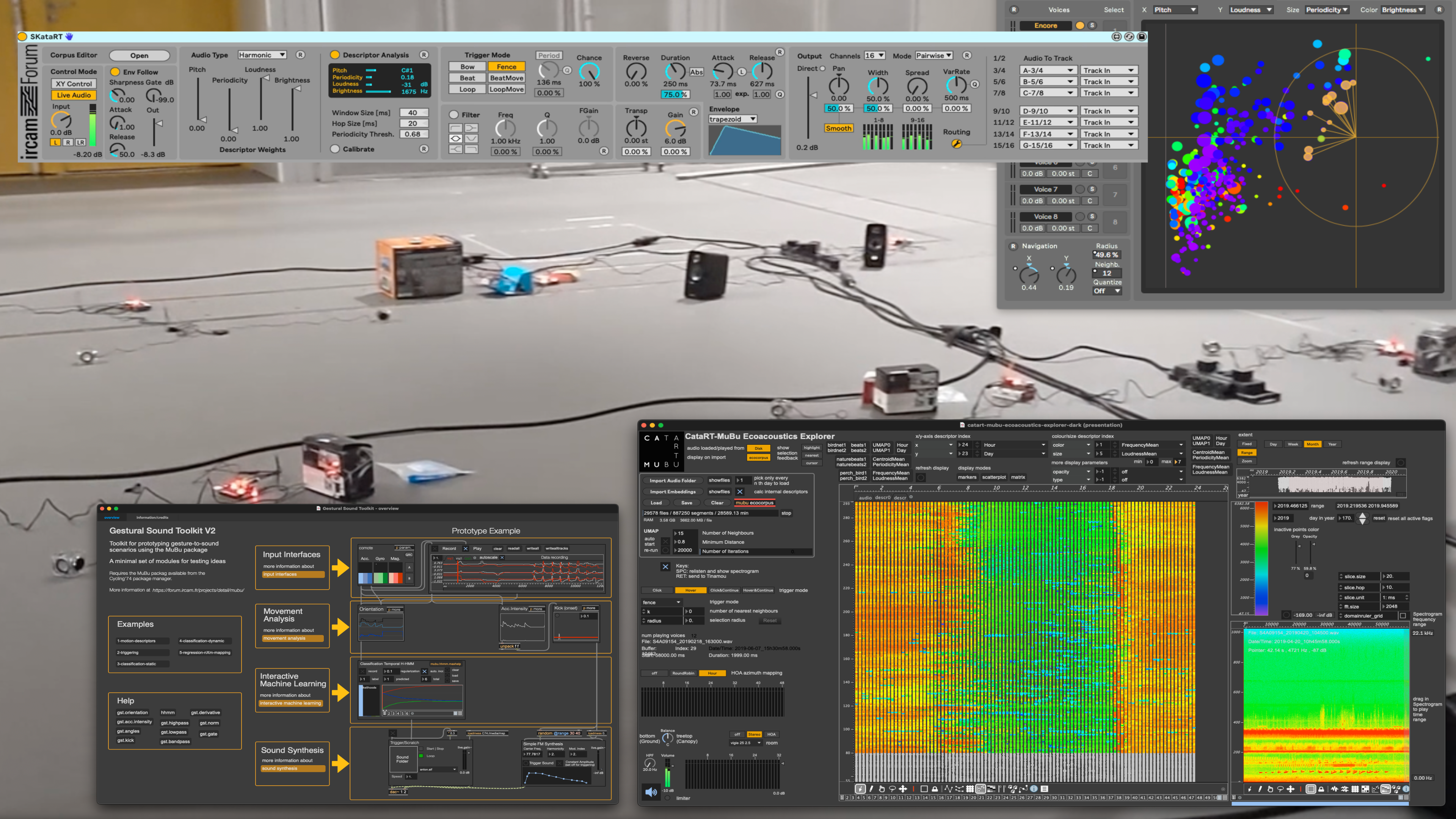 We will present new features of the MuBu for Max framework for multimodal analysis of sound and motion, interactive sound synthesis and machine learning, the CataRT and SKataRT corpus-based synthesis tools for Max and Ableton Live, the Gestural Sound Toolkit for the prototyping of gesture–sound interaction scenarios, and different versions, improvements and documention of the JavaScript ecosystem dedicated to distributed systems (soundworks, dotpi-tools, node-web-audio-api).