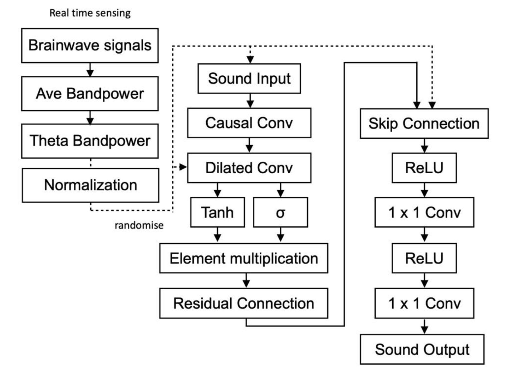 The subject in the soundscape wears EEG sensors that measure real-time theta waves (4-8 Hz) of brain activity. According to Sammler et al. (2007), increased activity in this frequency band is typically associated with intensified auditory pleasure. However, in response to this heightened brain-based pleasure, the AI—continuously learning from the real-time EEG data—intentionally disrupts the experience. It transforms the generated sounds, subtly altering pitches, waveforms, tempos and syncopations, gradually diverging from the original sound patterns the subject found pleasurable.
