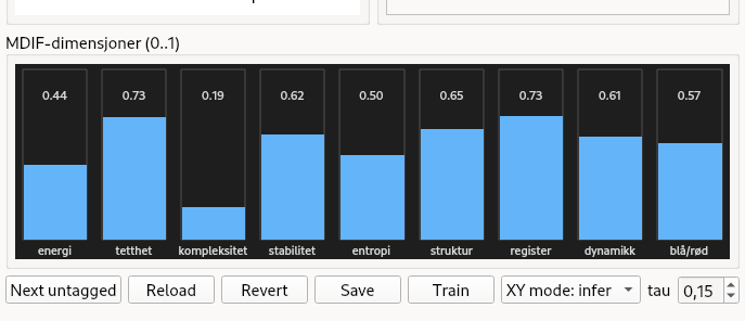 Instead of controlling dozens of algorithmic parameters directly, you interact with a learned notion of degrees of subjective similarity between your own samples (or class membership), where "similar" means "similar in a subjective artistic sense", not by grammars or rules. The manouvering in the trained model can be done interactively using the provided GUI - a 2D 'joystick', a set of sliders or a radar-plot - or searching and filtering in OM, or perhaps by other means.