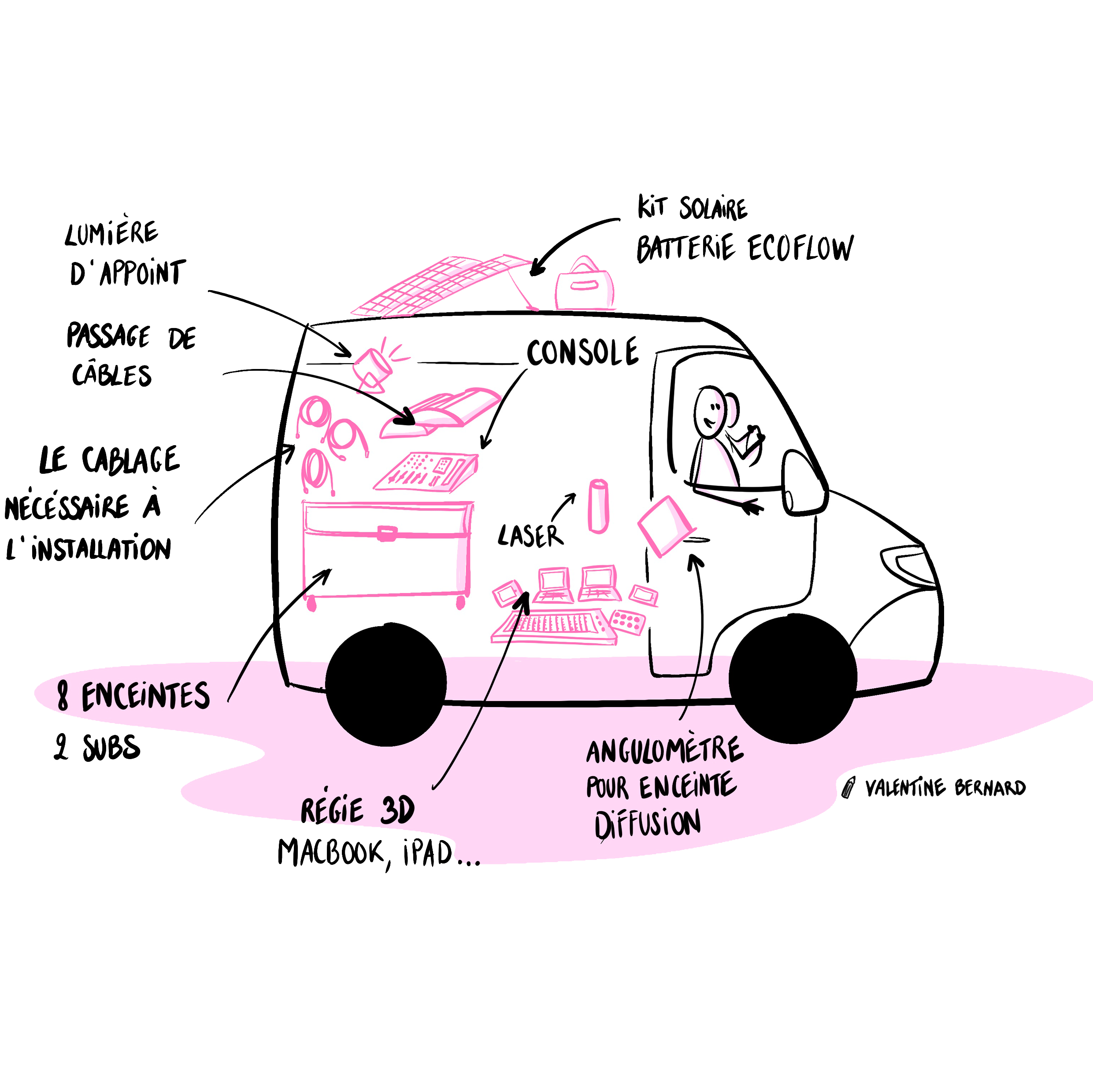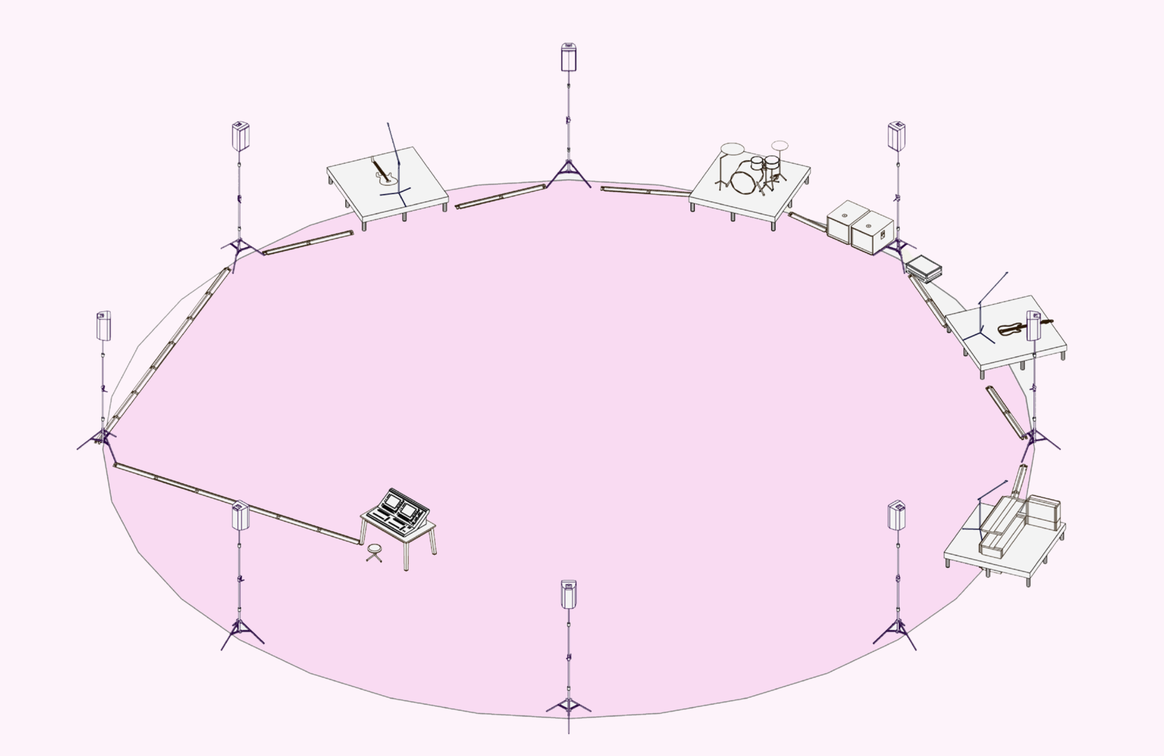 360Prod develops the Soundarium, a fully battery-powered, solar-charged immersive system designed for touring. With a circular speaker layout and real-time control via SPAT Revolution and OSC interfaces, it allows artists to perform immersive works in places with no infrastructure : from forests to festivals, abandoned spaces to proscenium stages.