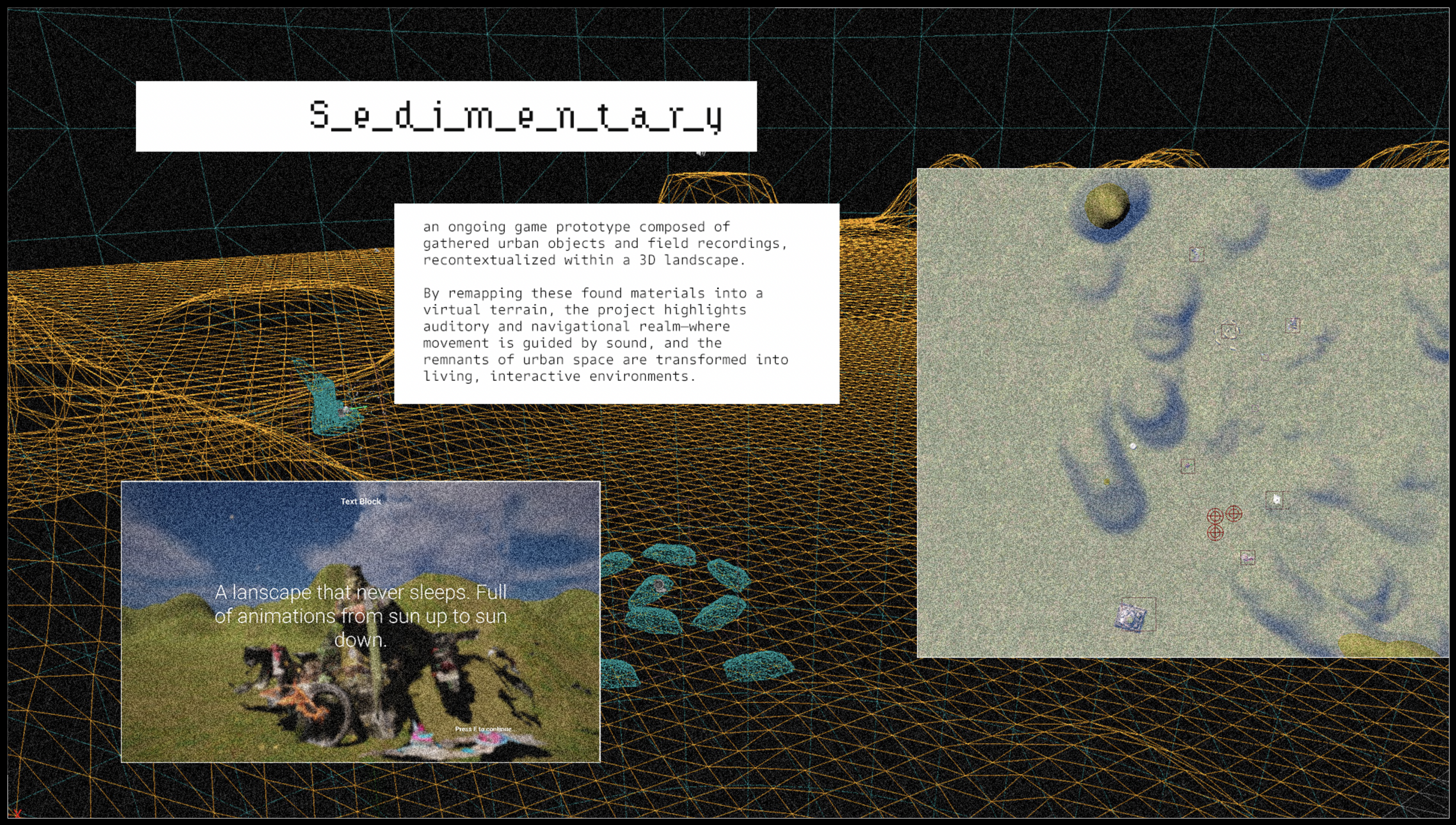 sonic_{imprints}° engages with the lived sonic realities of Filipino migrant workers in Taipei, examining how sound operates as a carrier of memory, cultural presence, and spatial belonging. Drawing on field recordings and psychogeographic methods such as dérive, the project constructs an audio-centered world in which users navigate through zones of tension, nostalgia, and resonance. Unlike conventional game design that prioritizes visual feedback, this space invites a different kind of interaction: one where listening becomes the primary mode of engagement.