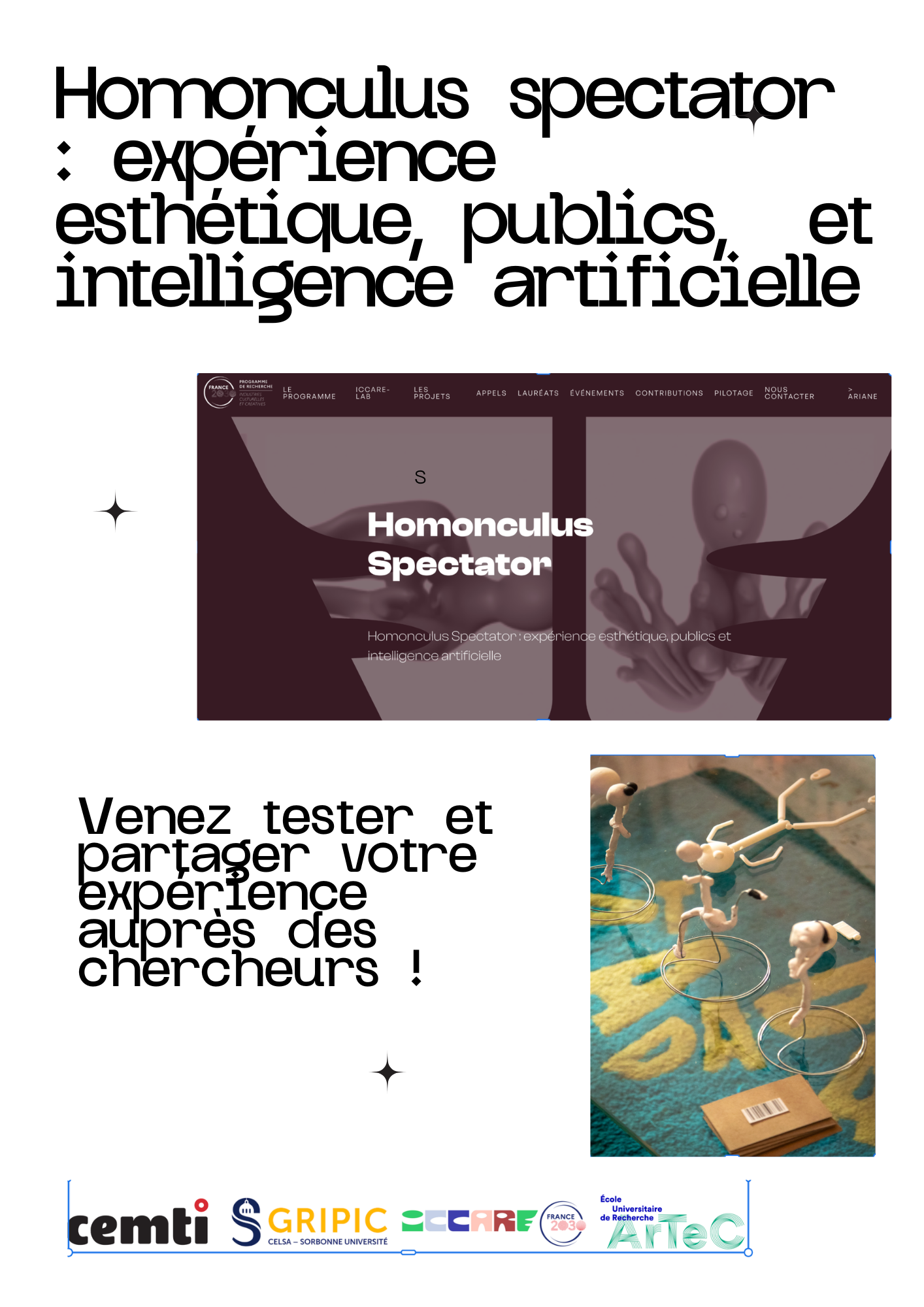 La visite se compose d’un temps de découverte de l’exposition et du dispositif, suivi d’un entretien d’environ quinze minutes avec les chercheurs, visant à recueillir les impressions des participants.