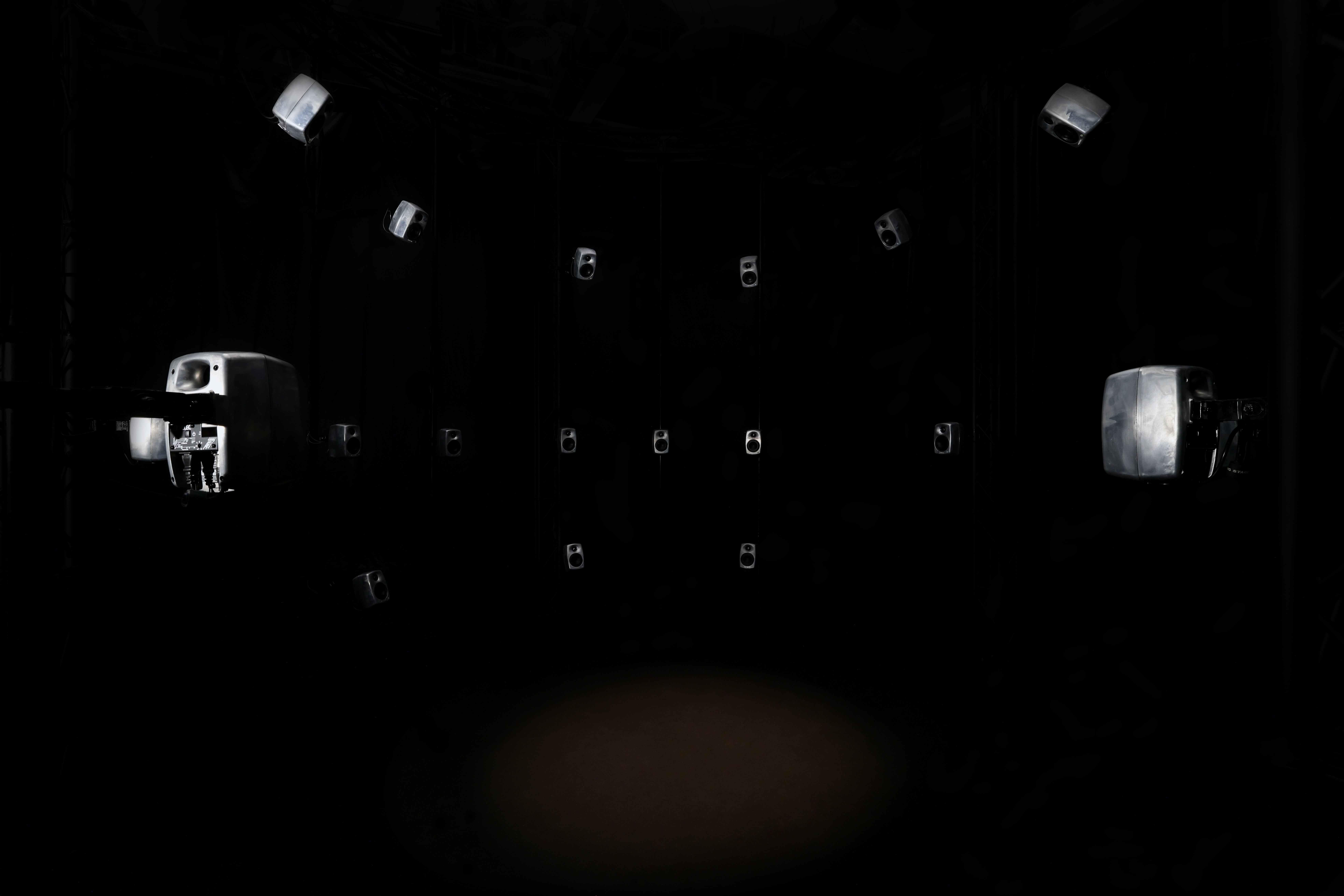 While sound systems used to be based on such standard formats as mono (1 channel), stereo (2 channels) and surround (5.1 channels), this work adopts the 22.2 channel surround format that was first implemented in the audio production and transmission of NHK’s 8K Satellite Broadcasting programs. It is, however, a format that the average music creator and listener rarely has a chance to use both as a production and a playback environment. In this exhibition, visitors can experience the work via a system that reproduces its sound stage in a different (2-channel) format.