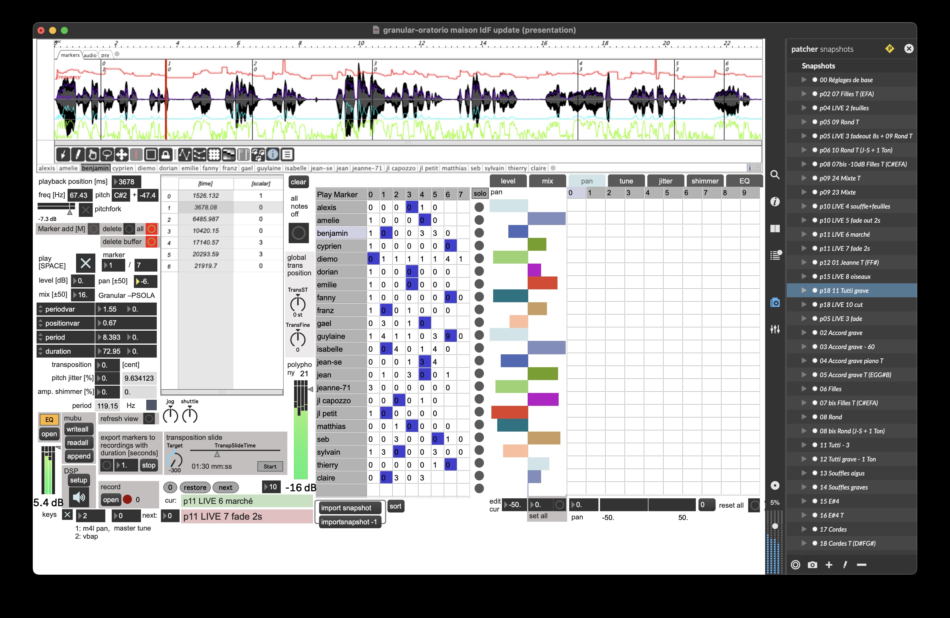 Ensemble Ikosikaihenagone of 21 musicians was founded by Benjamin Duboc in 2021. We will show how interactive synthesis techniques built with the MuBu framework for Max can be integrated into two comprovisation pieces to create a musical context that navigates between precision and liveness. In the piece Volumes II, additive synthesis with fine control of harmonics creates an immersive sonic bed for the acoustic instruments that can oscillate between stable and moving states. In the piece Oratorio, Mubu’s granular and PSOLA resynthesis is used to freeze the spoken voice of the musicians in order to create infinite chords retaining the identity of each individual voice, and allowing fine control of mix, micro-tuning and spatialisation.