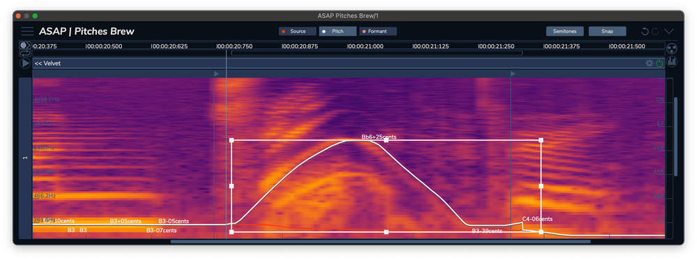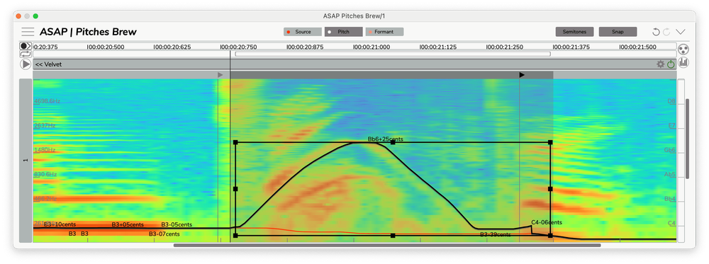 Basé sur l'extension ARA, Pitches Brew offre une représentation visuelle des fréquences fondamentales d'origine, des hauteurs attendues et des formants avec des courbes permettant de nombreuses modifications originales telles que le dessin, la transposition, l'étirement, la copie, etc.